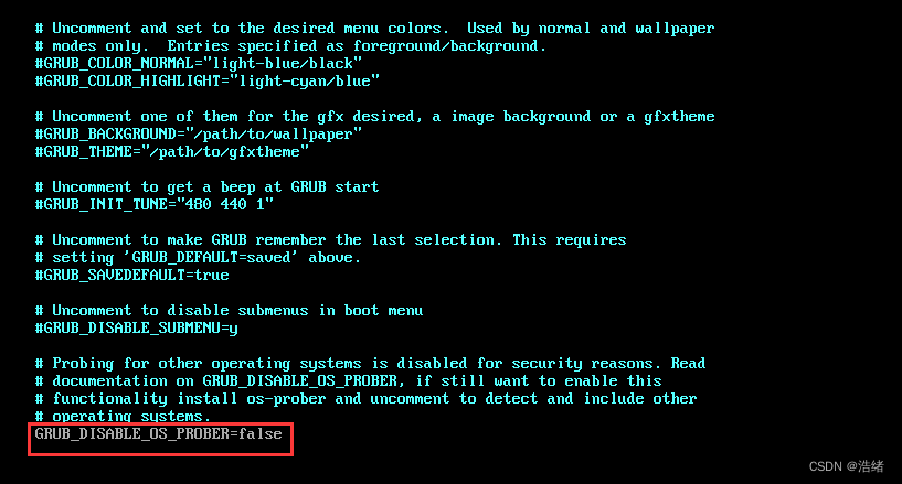 使用vim打开/etc/default/grub文件,搜索“GRUB_DISABLE_OS_PROBER=false”,并去掉这行开头的“#”。